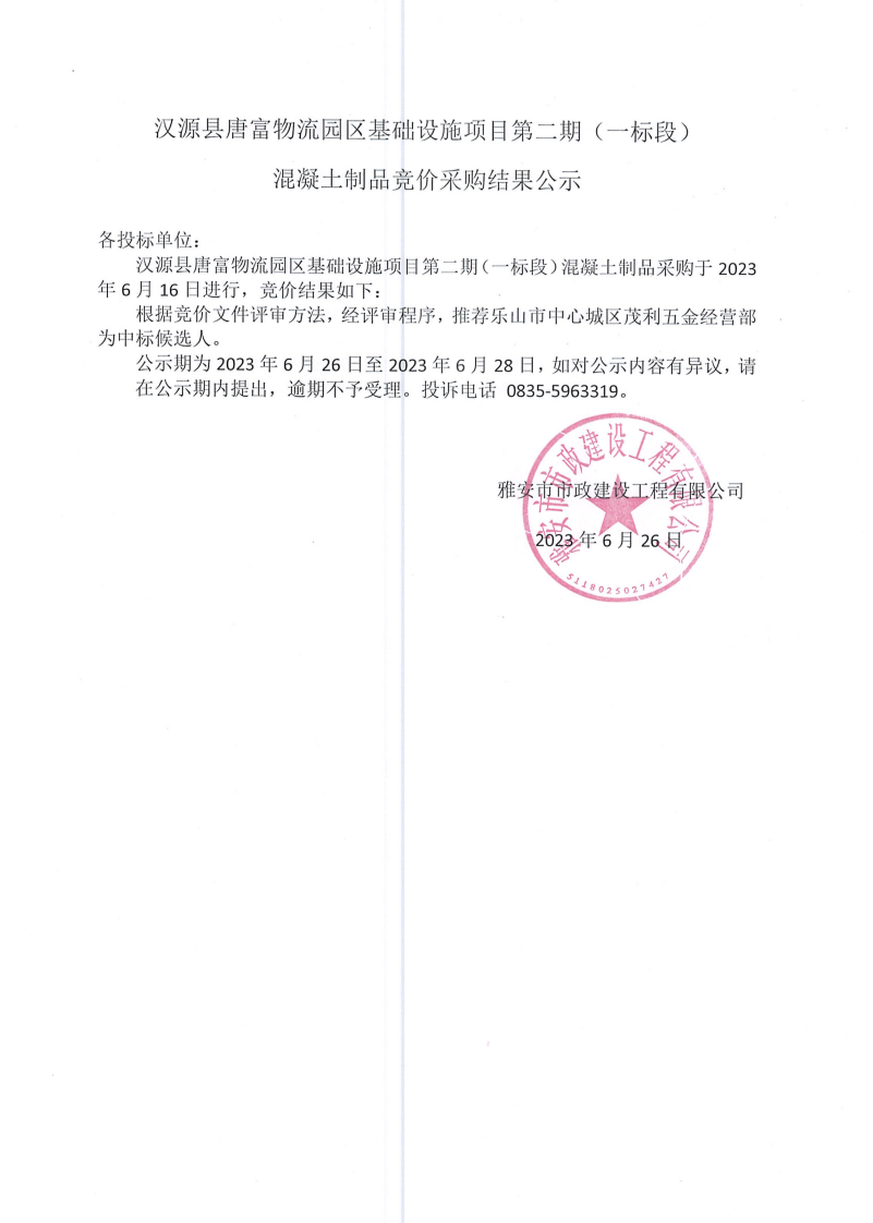 漢源縣唐富物流園區(qū)基礎(chǔ)設(shè)施項目第二期 (一標(biāo)段)混凝土制品采購競價結(jié)果公示