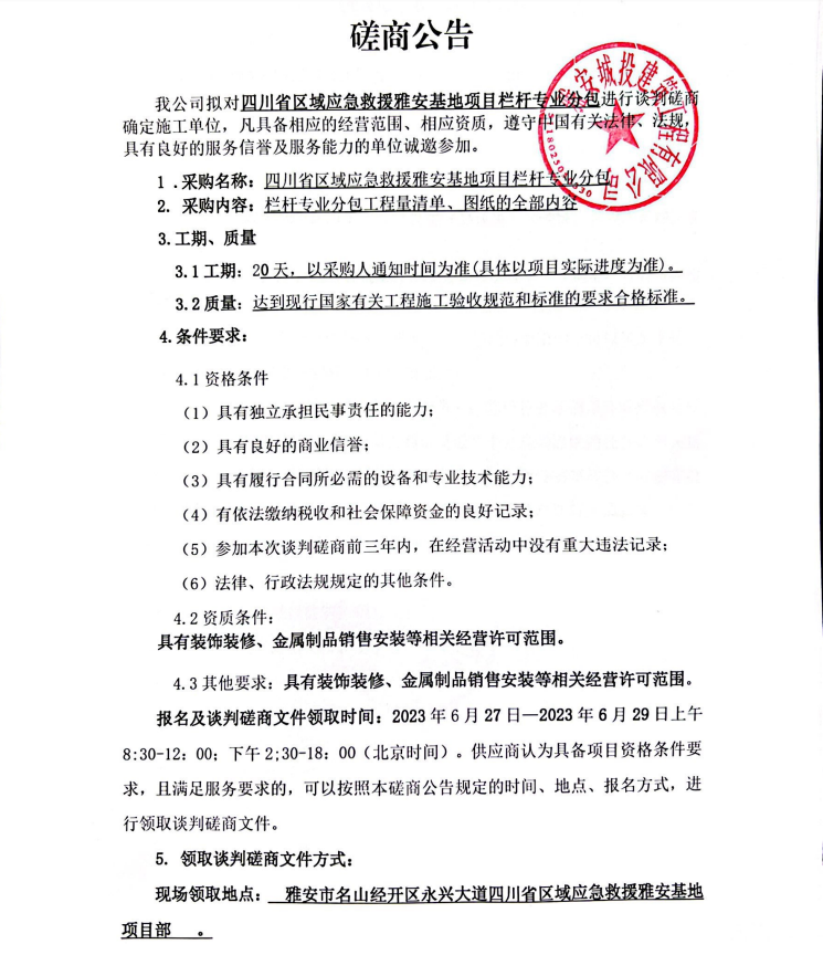 四川省區(qū)域應急救援雅安基地項目欄桿專業(yè)分包談判磋商公告