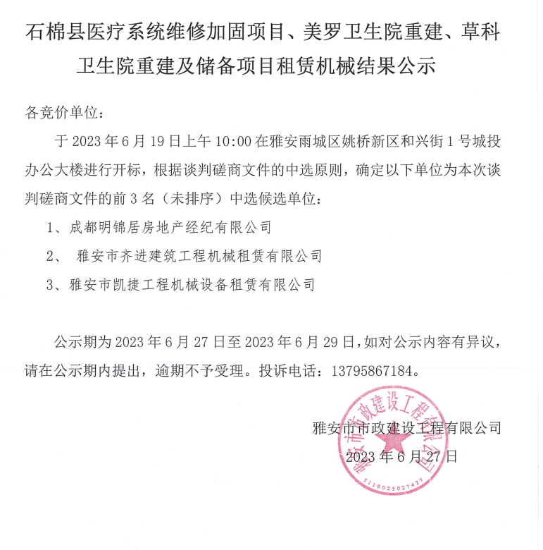 石棉縣醫(yī)療系統(tǒng)維修加固項(xiàng)目、美羅衛(wèi)生院重建、草科衛(wèi)生院重建及儲備項(xiàng)目租賃機(jī)械結(jié)果公示