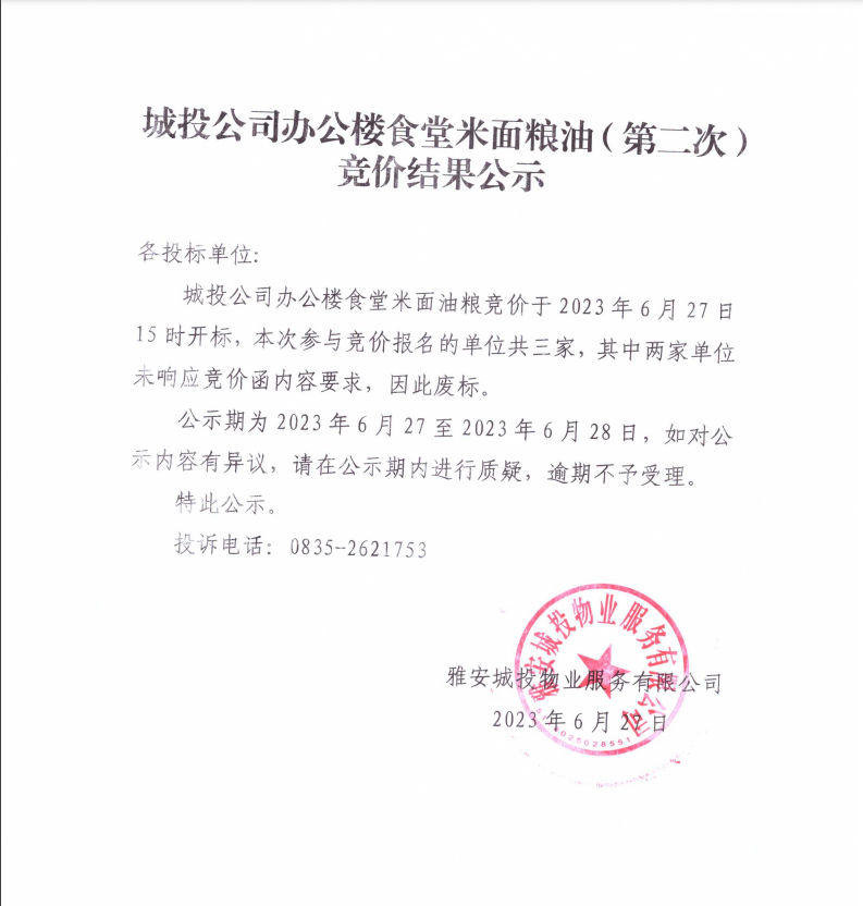 城投公司辦公樓食堂米面糧油(第二次)競(jìng)價(jià)結(jié)果公示