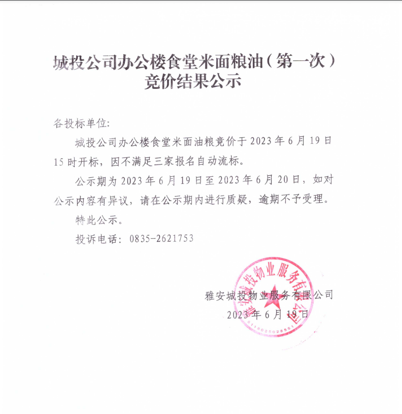 城投公司辦公樓食堂米面糧油(第一次)競價(jià)結(jié)果公示