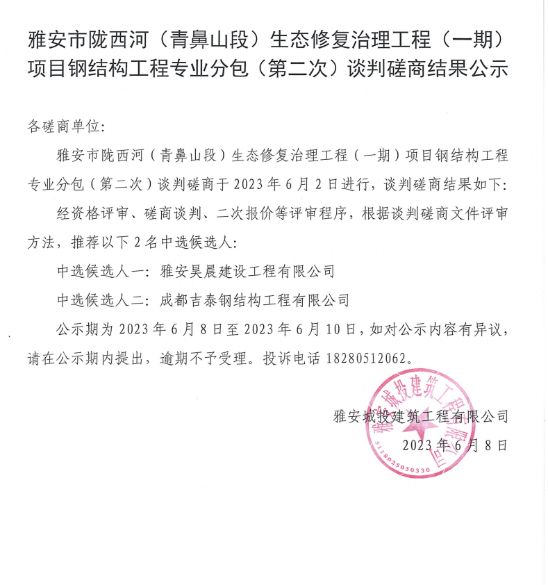 雅安市隴西河(青鼻山段)生態(tài)修復(fù)治理工程(一期)項目鋼結(jié)構(gòu)工程專業(yè)分包(第二次)談判磋商結(jié)果公示