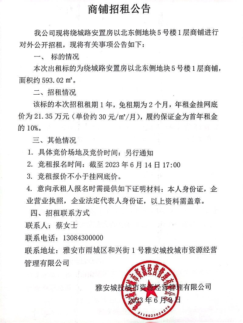繞城路安置房以北東側地塊5號樓1層商鋪招租公告