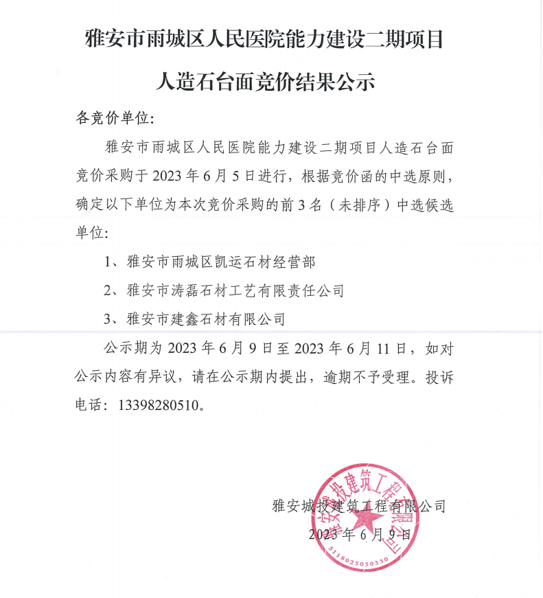 雅安市雨城區(qū)人民醫(yī)院能力建設(shè)二期項目人造石臺面競價結(jié)果公示