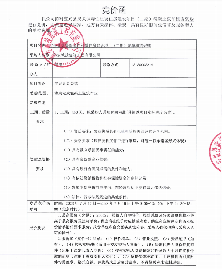 寶興縣靈關(guān)保障性租賃住房建設(shè)項目(二期)混凝土泵車租賃采購競價公告