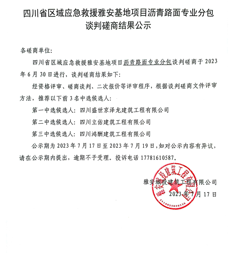 四川省區(qū)域應(yīng)急救援雅安基地項(xiàng)目瀝青路面專業(yè)分包談判磋商結(jié)果公示