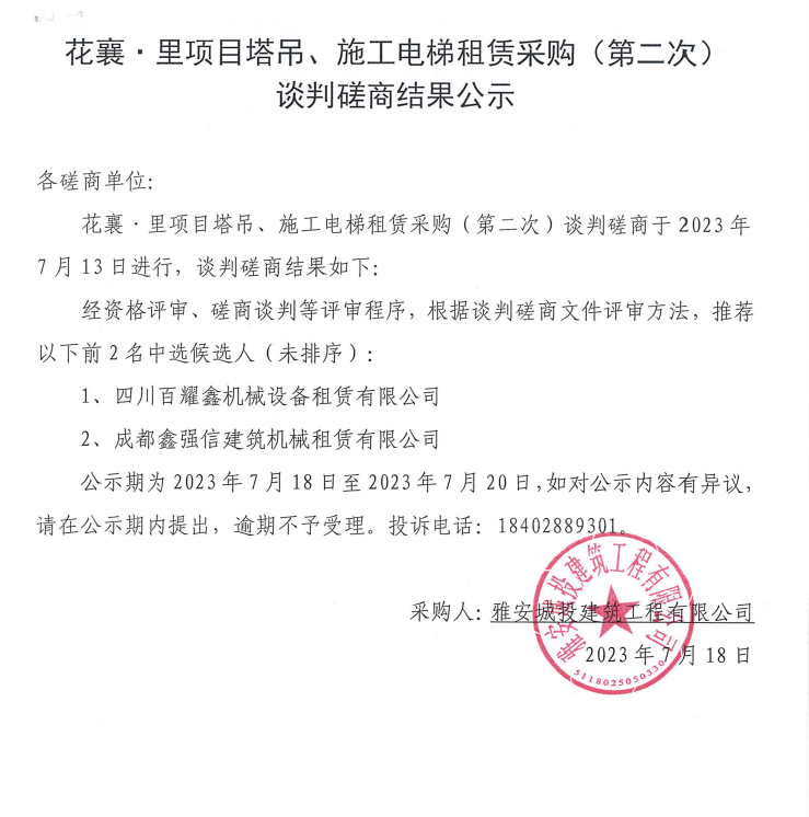 花襄·里項目塔吊、施工電梯租賃采購(第二次)談判磋商結(jié)果公示