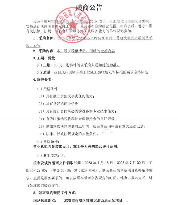 雅安市西康記憶生態(tài)文旅街區(qū)項目一號地塊項目木雕制品采購、安裝談判磋商公告