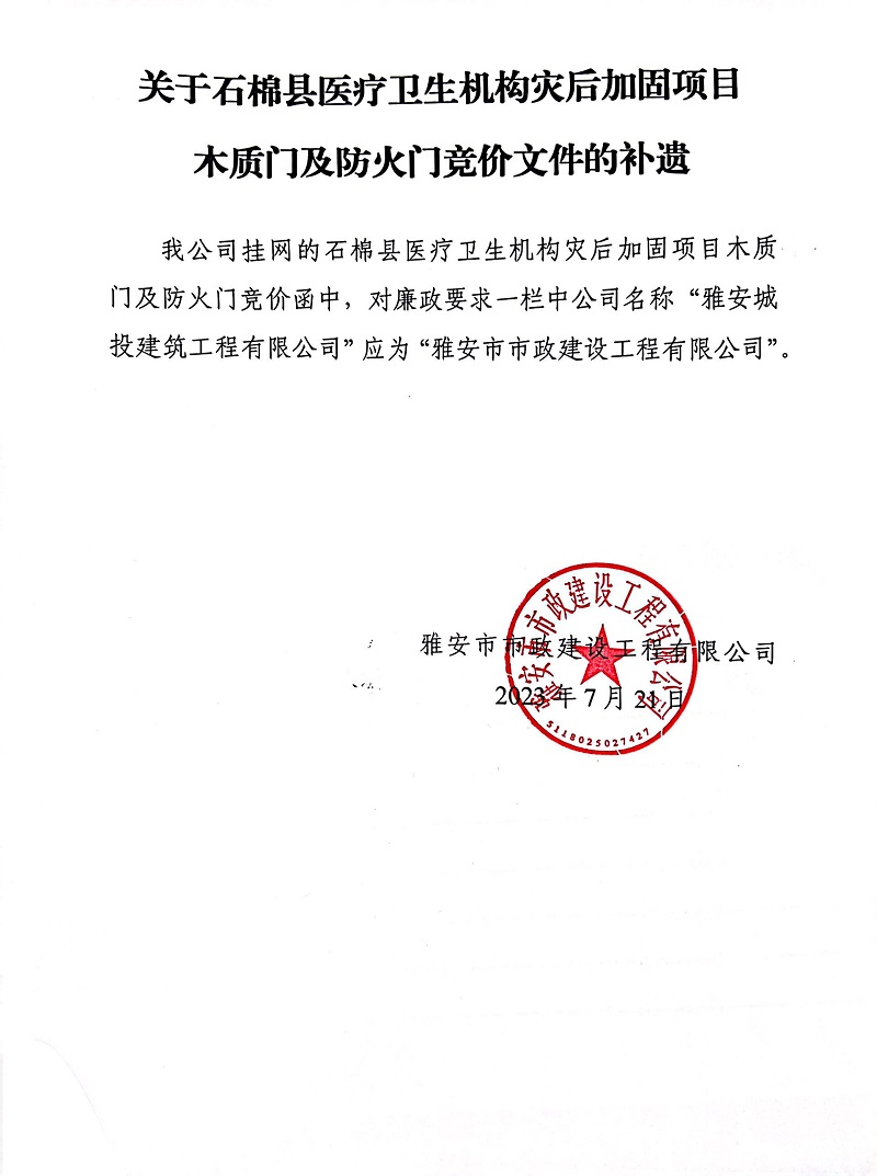 關于石棉縣醫(yī)療衛(wèi)生機構災后加固項目木質門及防火門競價文件的補遺