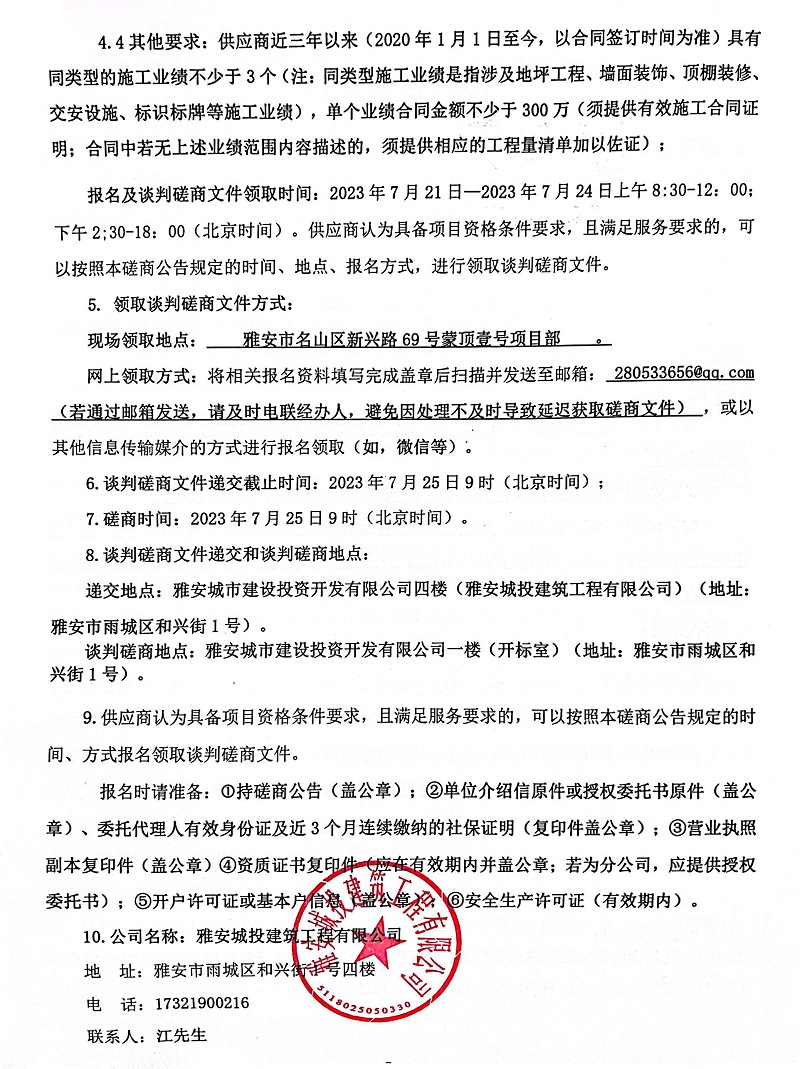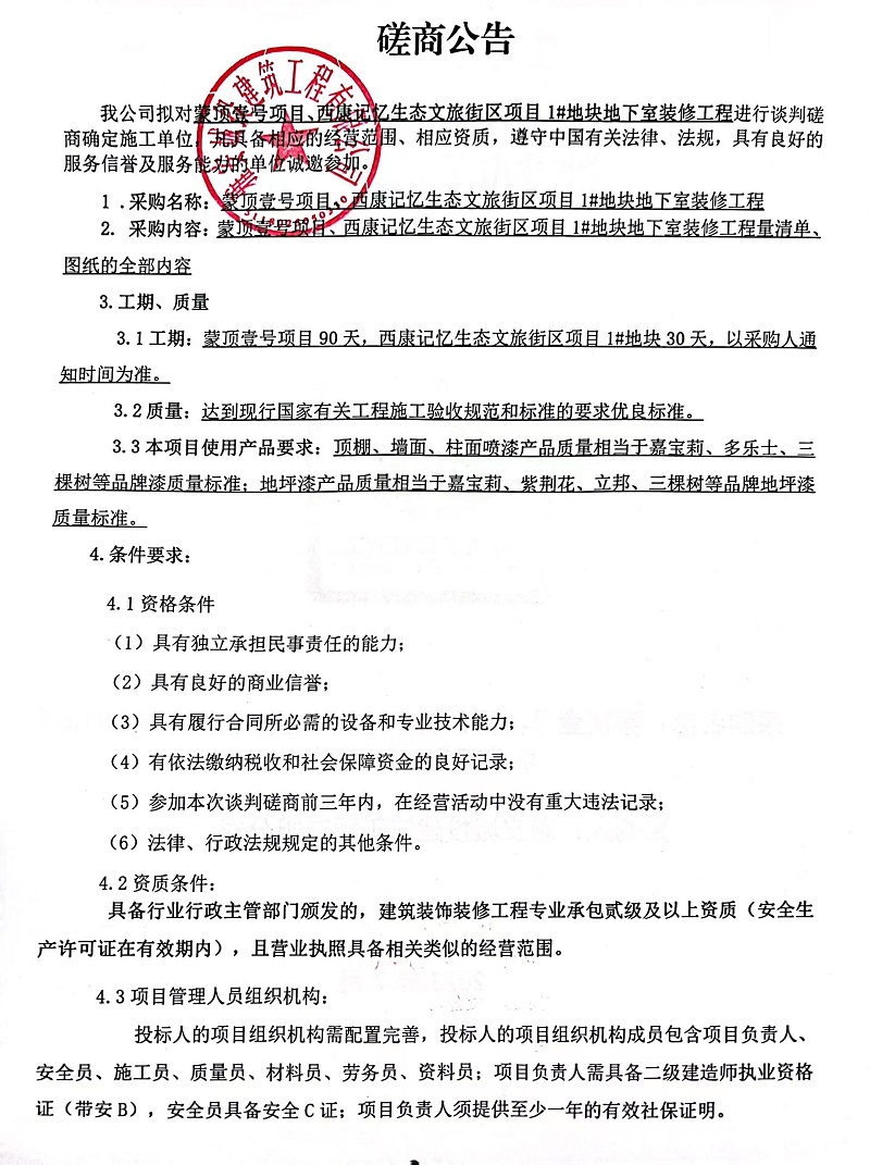 蒙頂壹號項目、西康記憶生態(tài)文旅街區(qū)項目1#地塊地下室裝修工程談判磋商公告