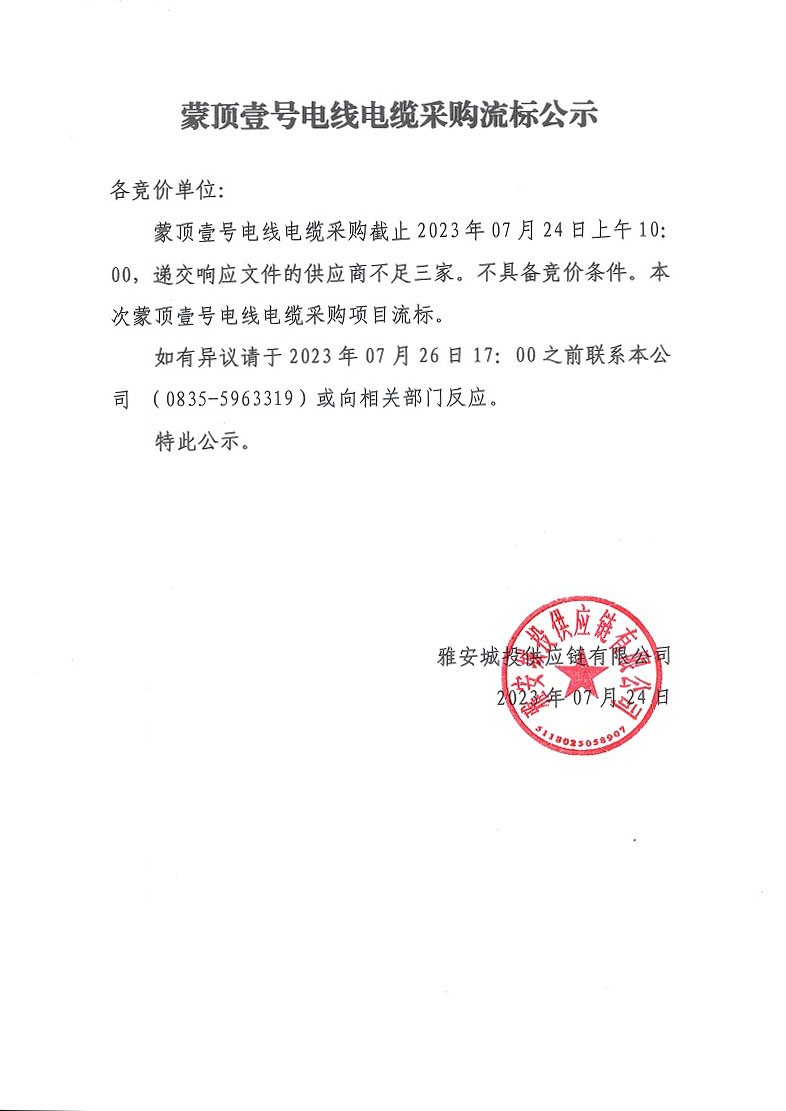 蒙頂壹號電線電纜采購流標(biāo)公示