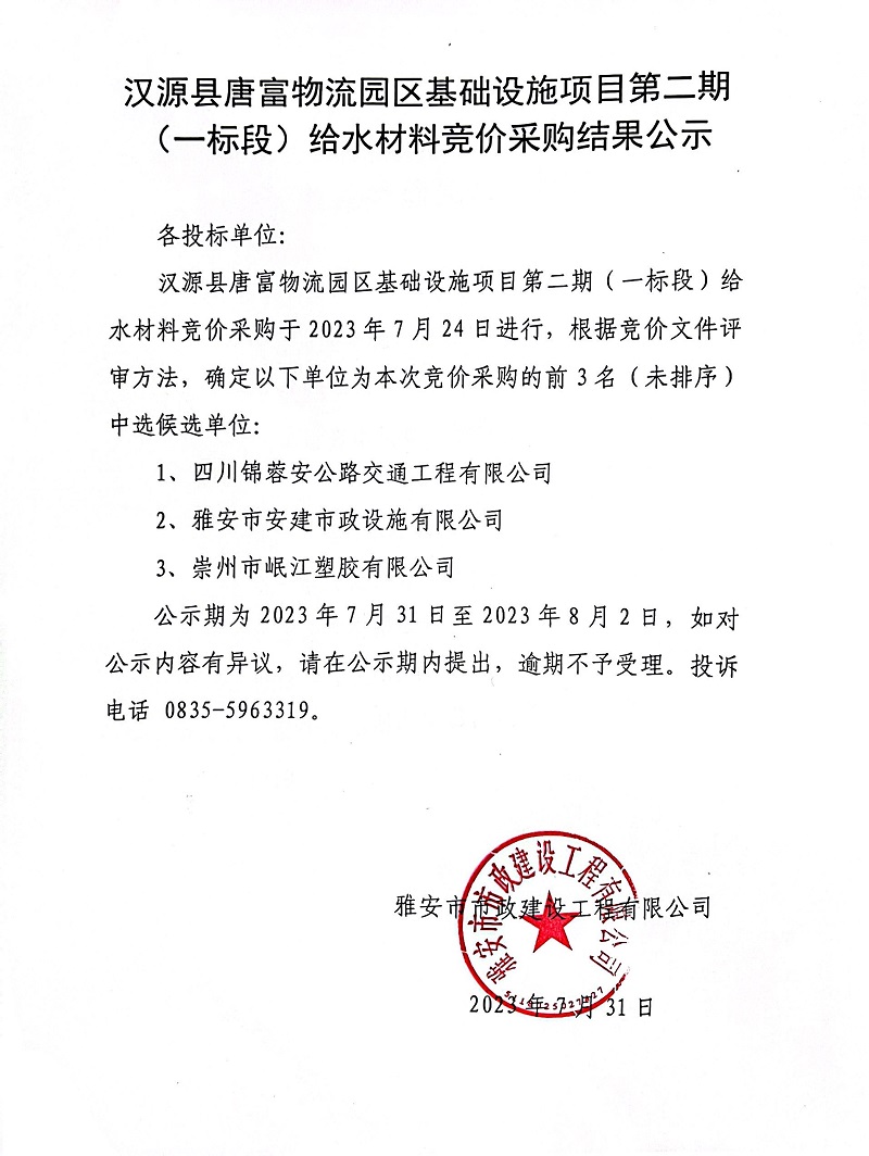 漢源縣唐富物流園區(qū)基礎(chǔ)設(shè)施項(xiàng)目第二期(一標(biāo)段)給水材料競價采購結(jié)果公示