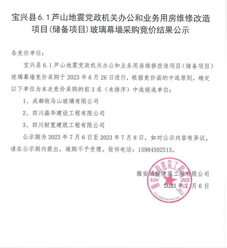 寶興縣6.1蘆山地震黨政機(jī)關(guān)辦公和業(yè)務(wù)用房維修改造項(xiàng)目(儲備項(xiàng)目)玻璃幕墻采購競價(jià)結(jié)果公示
