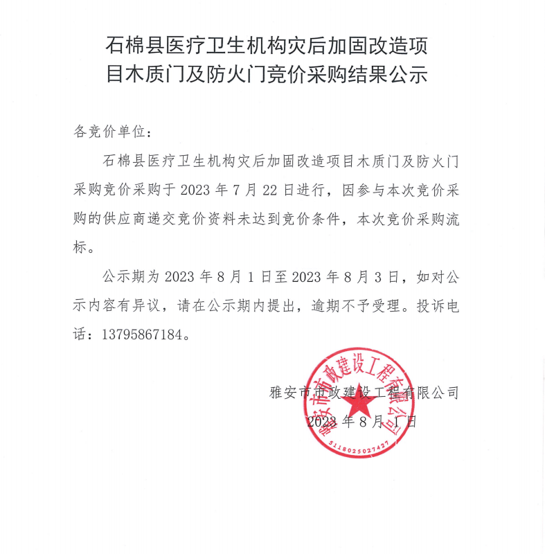 石棉縣醫(yī)療衛(wèi)生機(jī)構(gòu)災(zāi)后加固改造項目木質(zhì)門及防火門競價采購結(jié)果公示