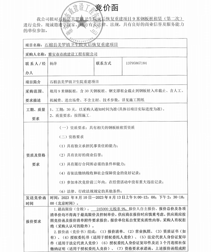 石棉縣美羅鎮(zhèn)衛(wèi)生院災(zāi)后恢復(fù)重建項目9米鋼板樁租賃(第二次)競價公告
