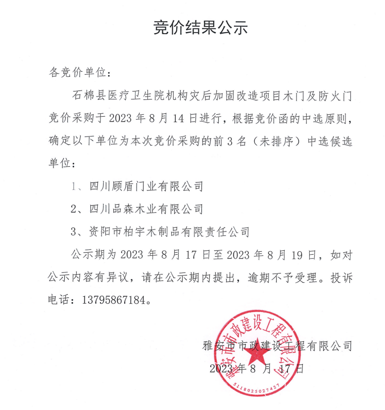 石棉縣醫(yī)療衛(wèi)生院機(jī)構(gòu)災(zāi)后加固改造項(xiàng)目木門及防火門競價采購結(jié)果公示