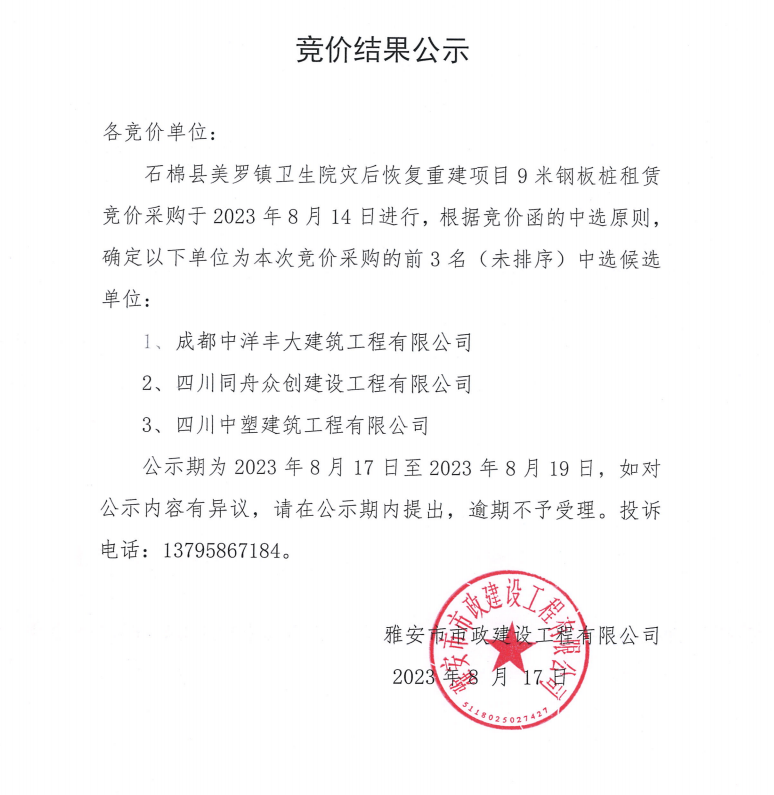 石棉縣美羅鎮(zhèn)衛(wèi)生院災(zāi)后恢復(fù)重建項目9米鋼板樁租賃競價結(jié)果公示