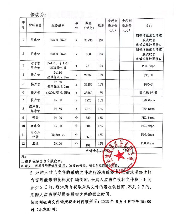 生活污水處理設施恢復重建項目管材材料采購補遺(一)
