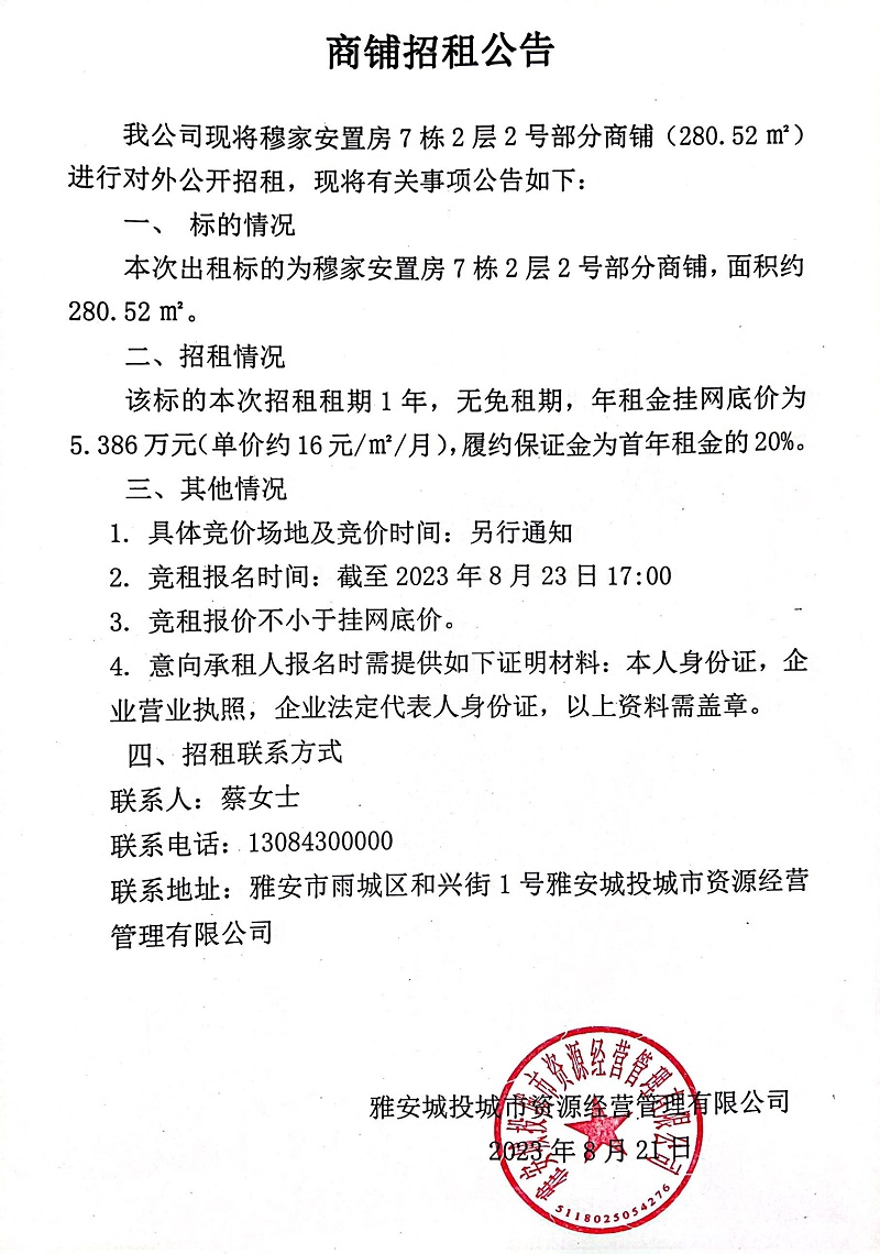 穆家安置房7棟2層2號(hào)部分商鋪招租公告