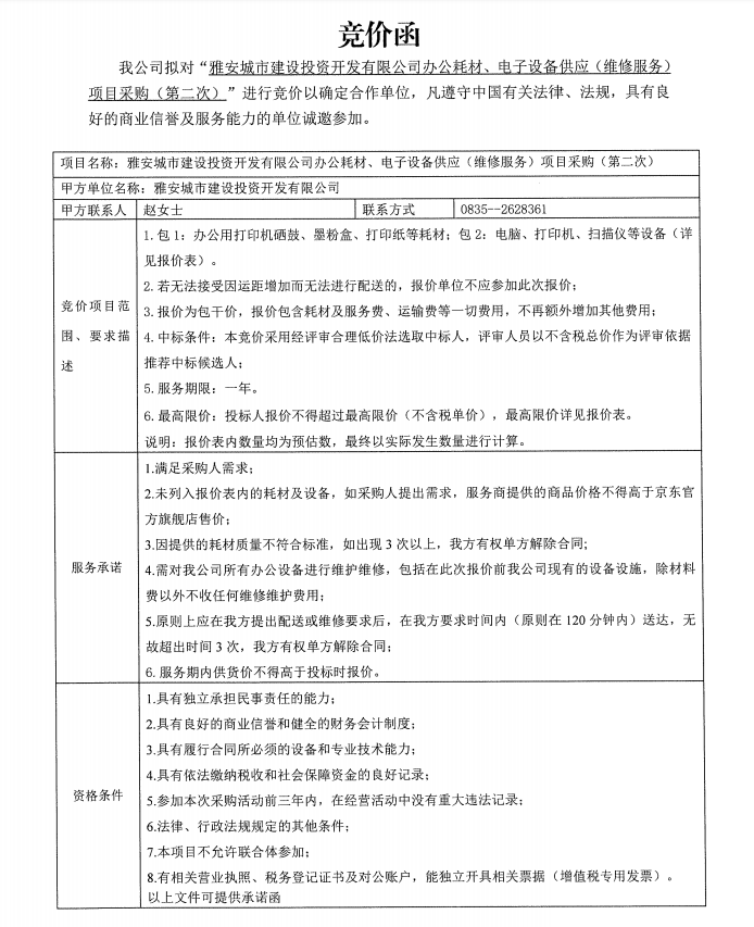 雅安城市建設(shè)投資開(kāi)發(fā)有限公司辦公耗材、電子設(shè)備供應(yīng)(維修服務(wù))項(xiàng)目采購(gòu)(第二次)公告