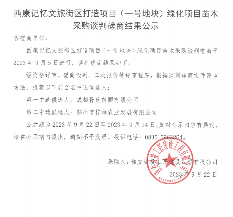 西康記憶文旅街區(qū)打造項(xiàng)目(一號(hào)地塊)綠化項(xiàng)目苗木采購談判磋商結(jié)果公示