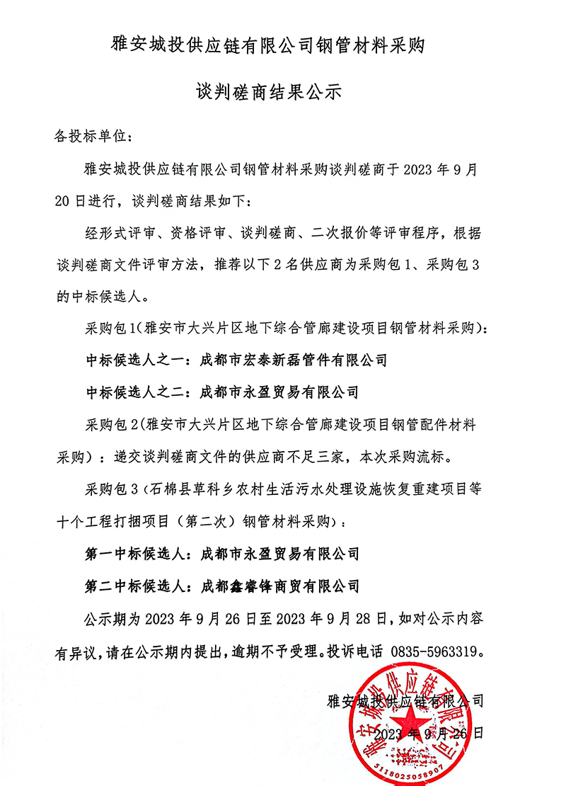 雅安城投供應鏈有限公司鋼管材料采購談判磋商結果公示