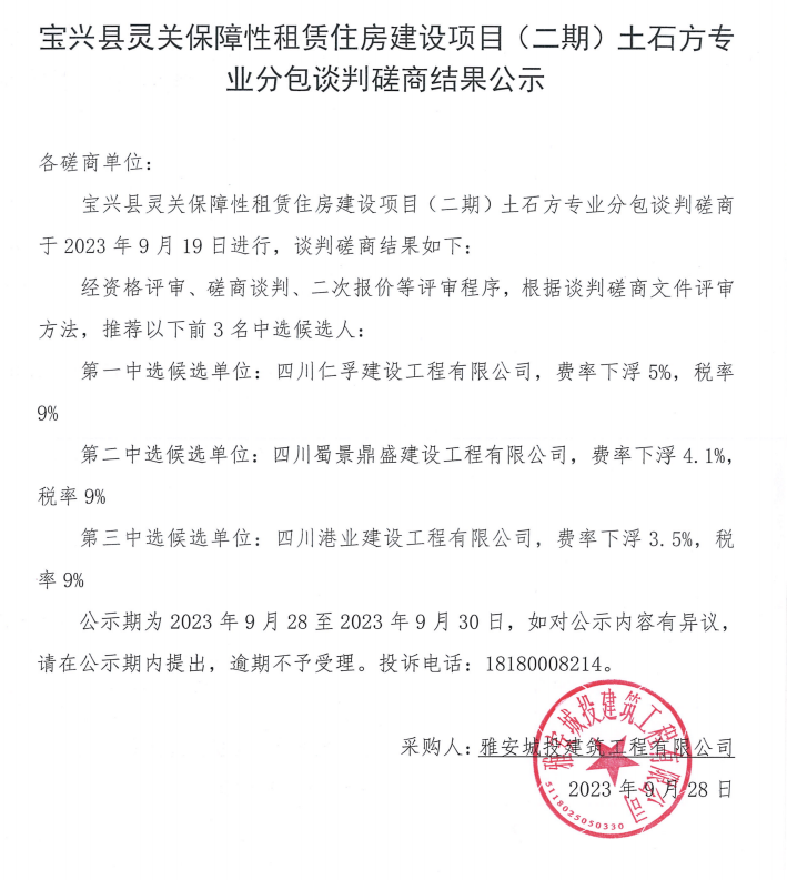寶興縣靈關(guān)保障性租賃住房建設(shè)項目(二期)土石方專業(yè)分包談判磋商結(jié)果公示