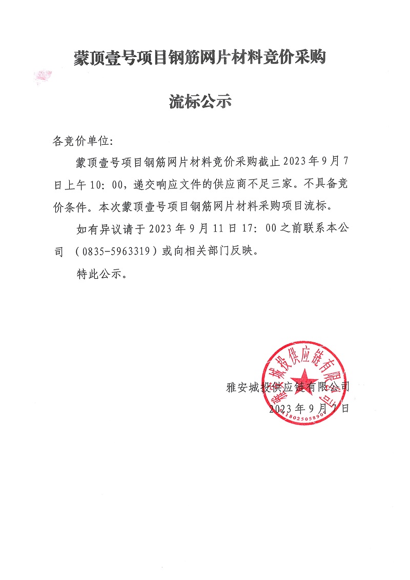 蒙頂壹號(hào)項(xiàng)目鋼筋網(wǎng)片材料競(jìng)價(jià)采購流標(biāo)公示