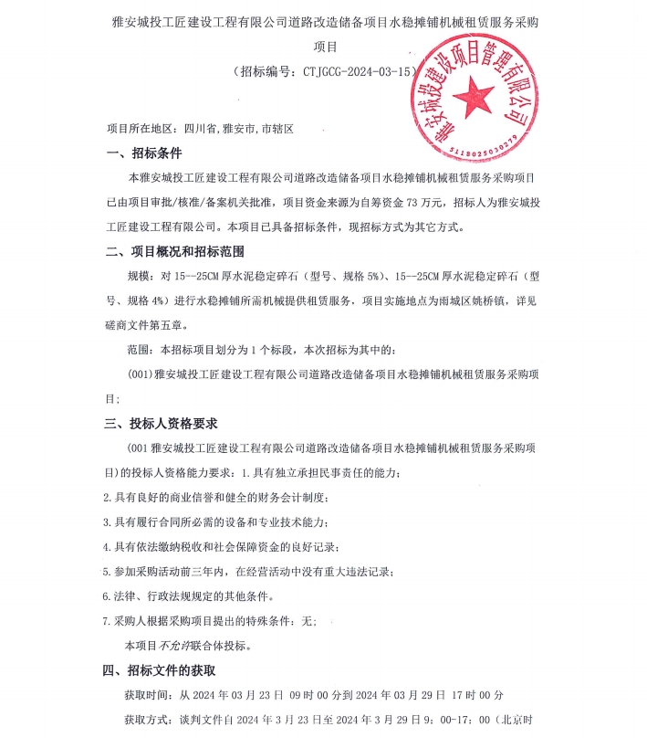雅安城投工匠建設(shè)工程有限公司道路改造儲(chǔ)備項(xiàng)目水穩(wěn)攤鋪機(jī)械租賃服務(wù)采購項(xiàng)目公告