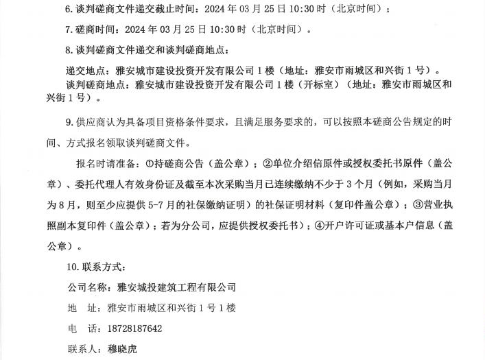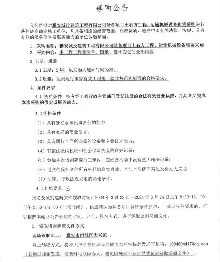 雅安城投建筑工程有限公司儲備項目土石工程、運輸機械設(shè)備租賃采購磋商公告