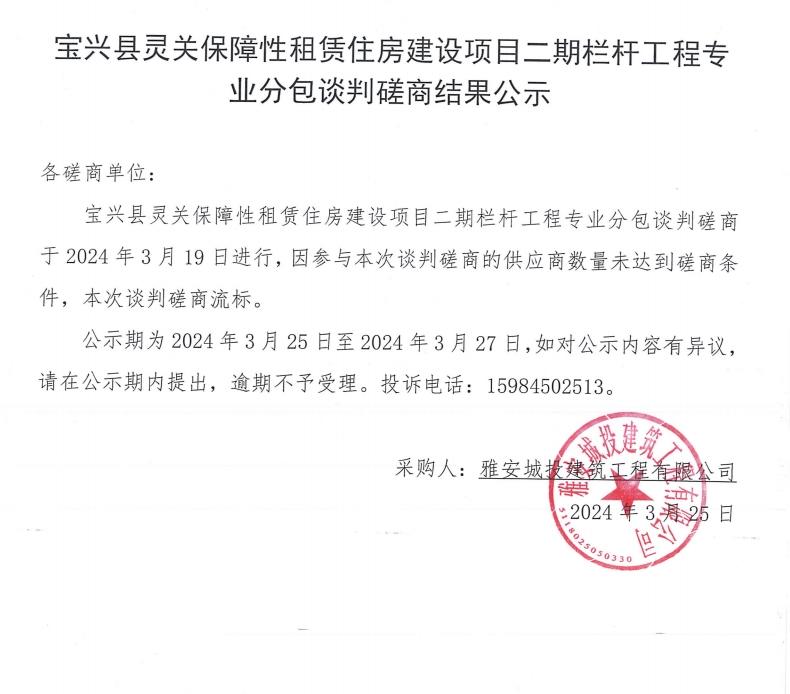 寶興縣靈關(guān)保障性租賃住房建設項目二期欄桿工程專業(yè)分包談判磋商結(jié)果公示