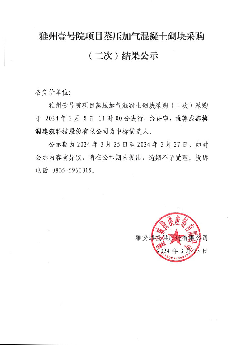 雅州壹號院項(xiàng)目蒸壓加氣混凝土砌塊采購(第二次)結(jié)果公示