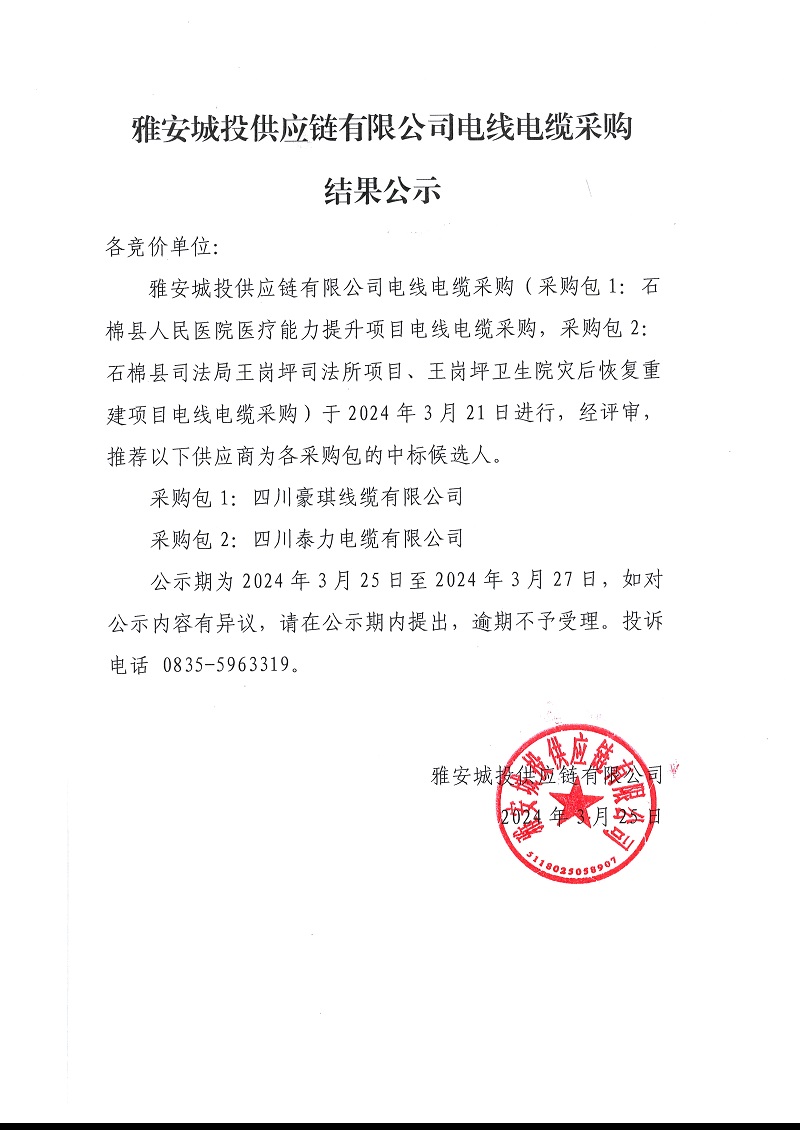 雅安城投供應(yīng)鏈有限公司電線電纜采購(gòu)結(jié)果公示