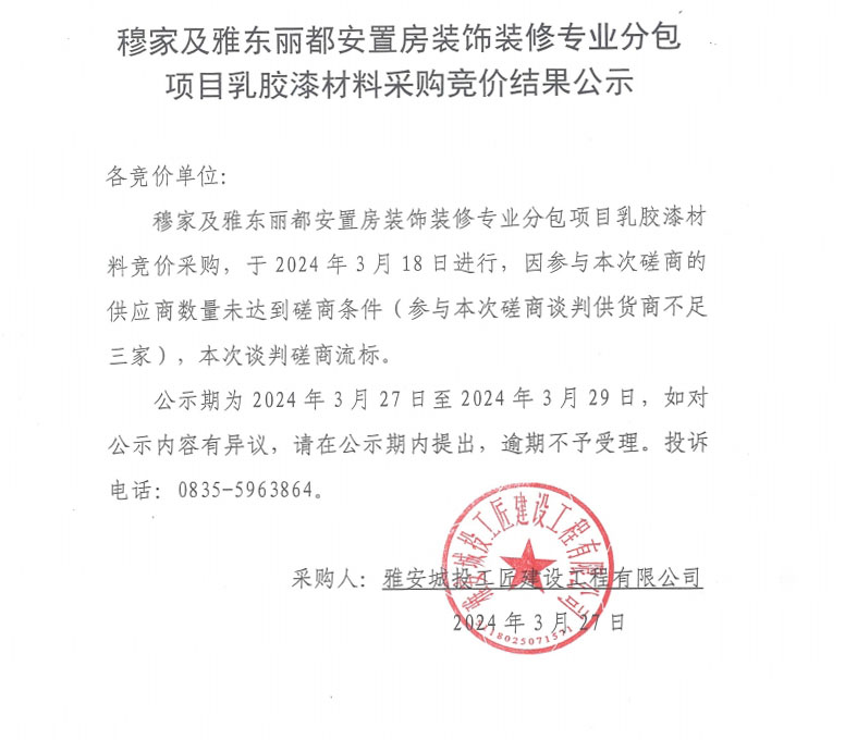 穆家及雅東麗都安置房裝飾裝修專業(yè)分包項(xiàng)目乳膠漆材料采購(gòu)競(jìng)價(jià)結(jié)果公示