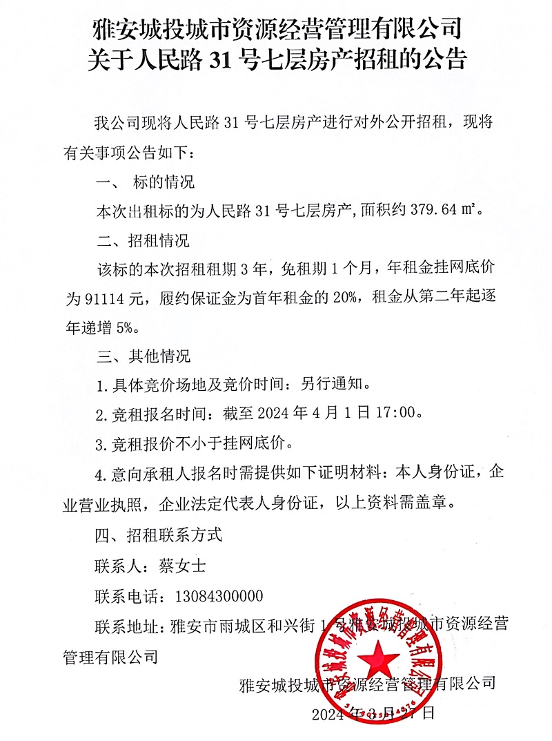 雅安城投城市資源經(jīng)營管理有限公司關于人民路31號七層房產(chǎn)招租的公告
