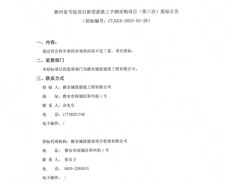雅州壹號院項(xiàng)目新型懸挑工字鋼采購項(xiàng)目(第三次)廢標(biāo)公告