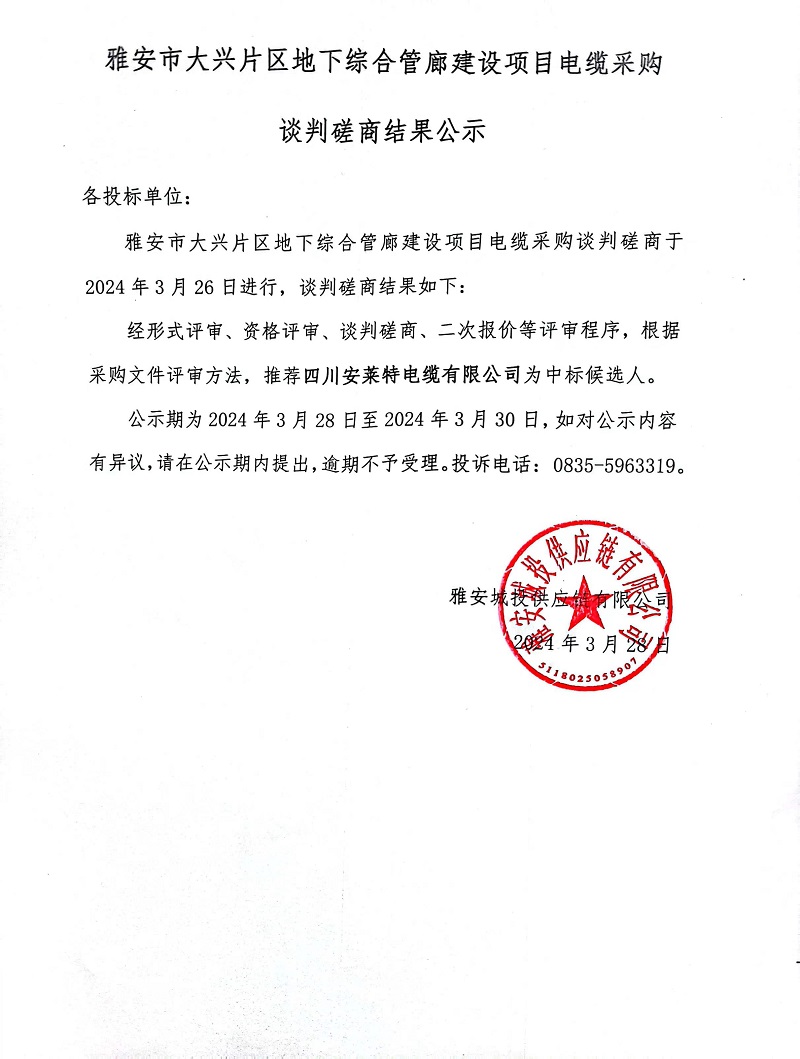 雅安市大興片區(qū)地下綜合管廊建設(shè)項(xiàng)目電纜采購(gòu)談判磋商結(jié)果公示