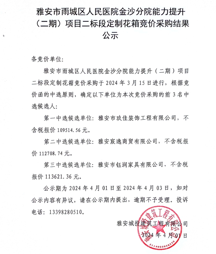 雅安市雨城區(qū)人民醫(yī)院金沙分院能力提升(二期)項(xiàng)目二標(biāo)段定制花箱競價采購結(jié)果公示