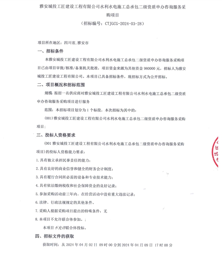雅安城投工匠建設(shè)工程有限公司水利水電施工總承包二級(jí)資質(zhì)申辦咨詢服務(wù)采購(gòu)項(xiàng)目公告