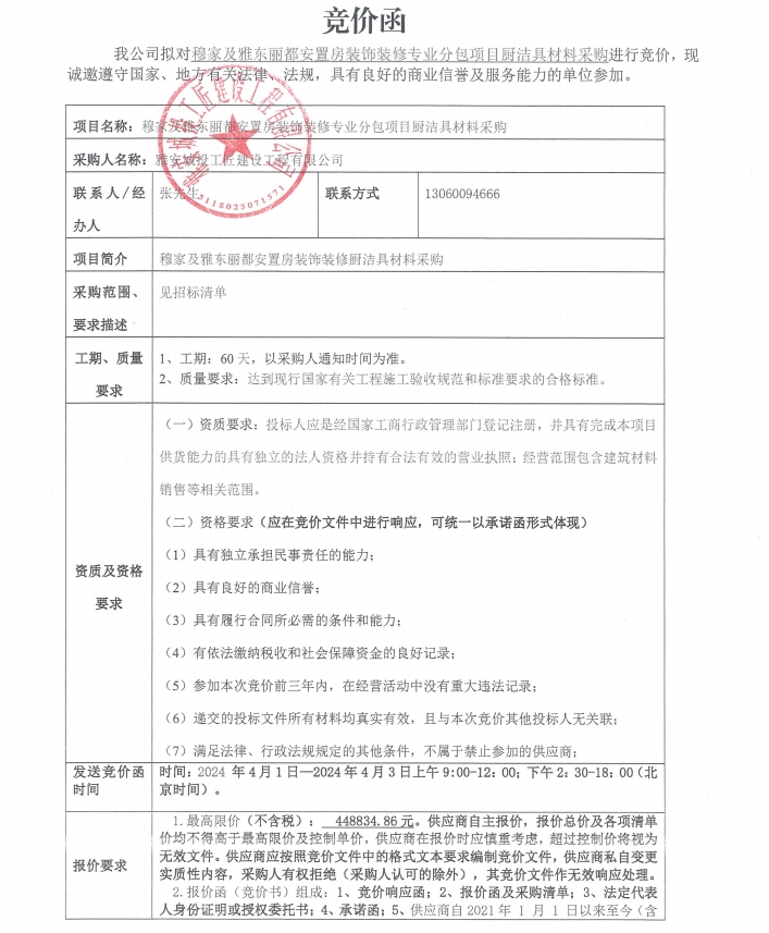 穆家及雅東麗都安置房裝飾裝修專業(yè)分包項目廚潔具材料采購競價公告