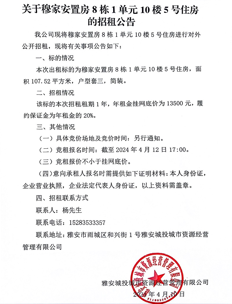 關于穆家安置房8棟1單元10樓5號住房的招租公告