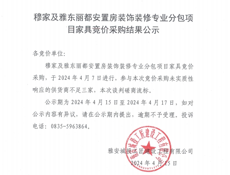 穆家及雅東麗都安置房裝飾裝修專業(yè)分包項目家具競價采購結果公示
