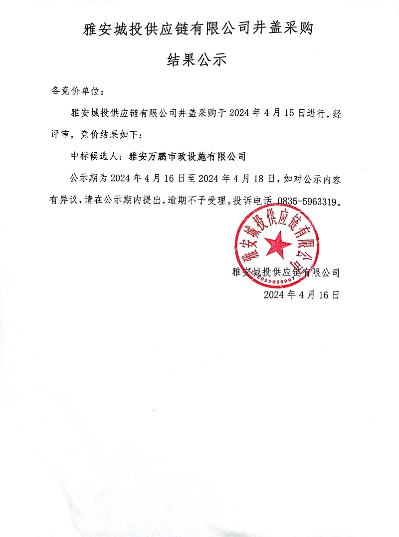 雅安城投供應鏈有限公司井蓋采購結(jié)果公示