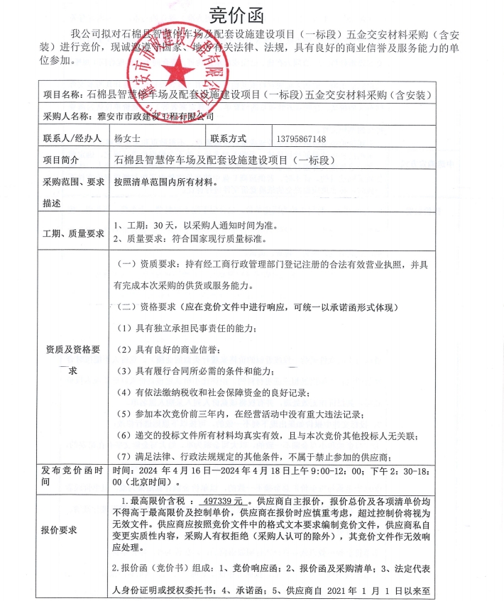 石棉縣智慧停車場(chǎng)及配套設(shè)施建設(shè)項(xiàng)目(一標(biāo)段)五金交安材料(含安裝)競(jìng)價(jià)公告