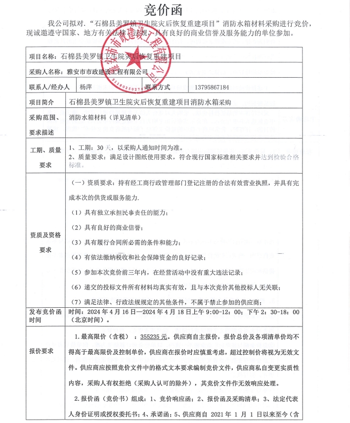 石棉縣美羅鎮(zhèn)衛(wèi)生院災(zāi)后恢復(fù)重建項(xiàng)目消防水箱材料采購(gòu)競(jìng)價(jià)公告