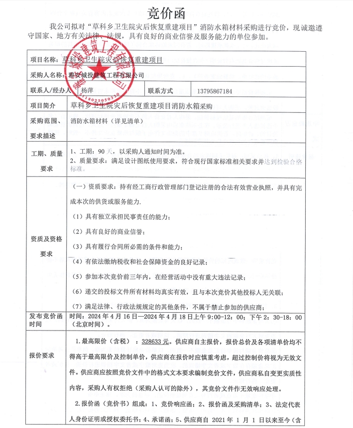 石棉縣草科鄉(xiāng)衛(wèi)生院災(zāi)后恢復(fù)重建項(xiàng)目消防水箱材料采購競價(jià)公告