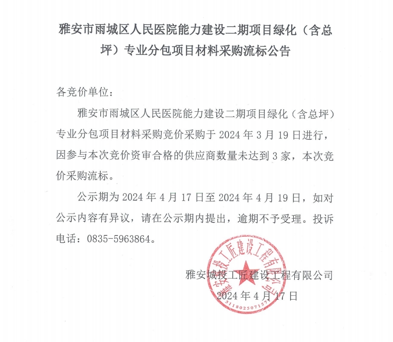 雅安市雨城區(qū)人民醫(yī)院能力建設(shè)二期項(xiàng)目綠化(含總坪)專業(yè)分包項(xiàng)目材料采購流標(biāo)公告