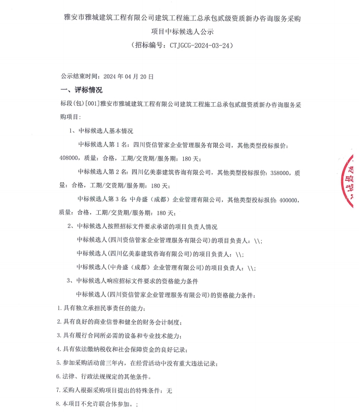雅安市雅城建筑工程有限公司建筑工程施工總承包貳級資質(zhì)新辦咨詢服務采購項目中標候選人公示