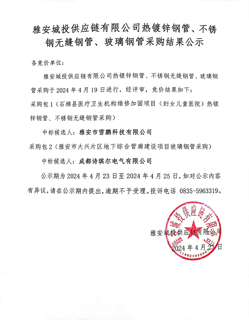 雅安城投供應(yīng)鏈有限公司熱鍍鋅鋼管、不銹鋼無縫鋼管、玻璃鋼管采購結(jié)果公示
