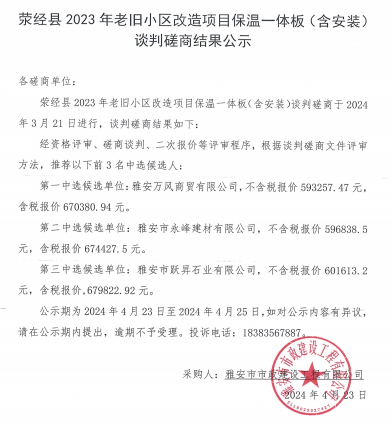 滎經(jīng)縣2023年老舊小區(qū)改造項(xiàng)目保溫一體板(含安裝)談判磋商結(jié)果公示